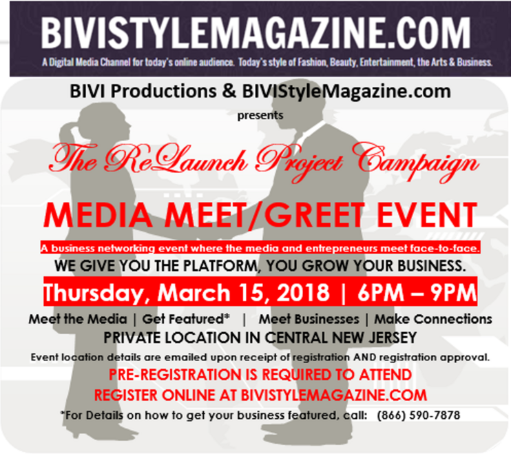 Join us as we bring together businesses, talent, personalities, and the media for one eventful evening of business networking and media exposure. Our mission is to promote today’s rising stars for the sole purpose of helping your business get the media exposure it needs to grow. We believe a rising star to be a business, talent, or personality that has not gained the media exposure it needs to successfully penetrate the market. As we embark upon BIVISTYLEMAGAZINE.COM’s ReLaunch Project campaign initiatives, celebrate with us as we share tips on turning your ideas into enterprises and Marketing Your Business the Right Way through branding and event planning. We will also introduce you to strategic media programs that will help you launch or expand your business. The festivities planned for the evening begins with our business card exchange and networking gala. Our mission to promote today’s rising stars continues as we share the benefits of online marketing and you how you can get your business featured inside an upcoming issue of BIVISTYLEMAGAZINE.COM—our lifestyle magazine and digital marketing channel featuring today’s style of fashion, beauty, entertainment, the arts, and business.